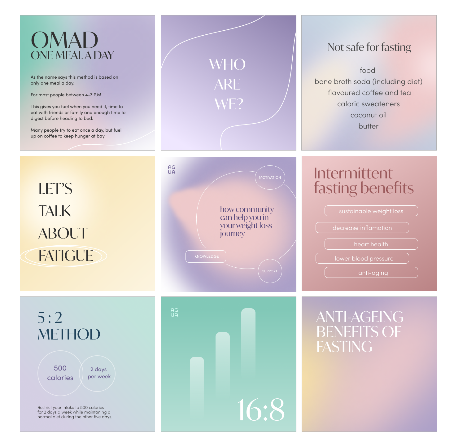 I curated a captivating mood board to inspire the vision for our Instagram. My goal was to create a gentle yet affirming atmosphere, where women feel informed and empowered. To achieve this, I incorporated bold lettering and soft gradients, introducing a pleasing contrast. Unlike other fasting apps with cartoon animations and childlike designs, I wanted to prioritize a design that specifically resonates with women.